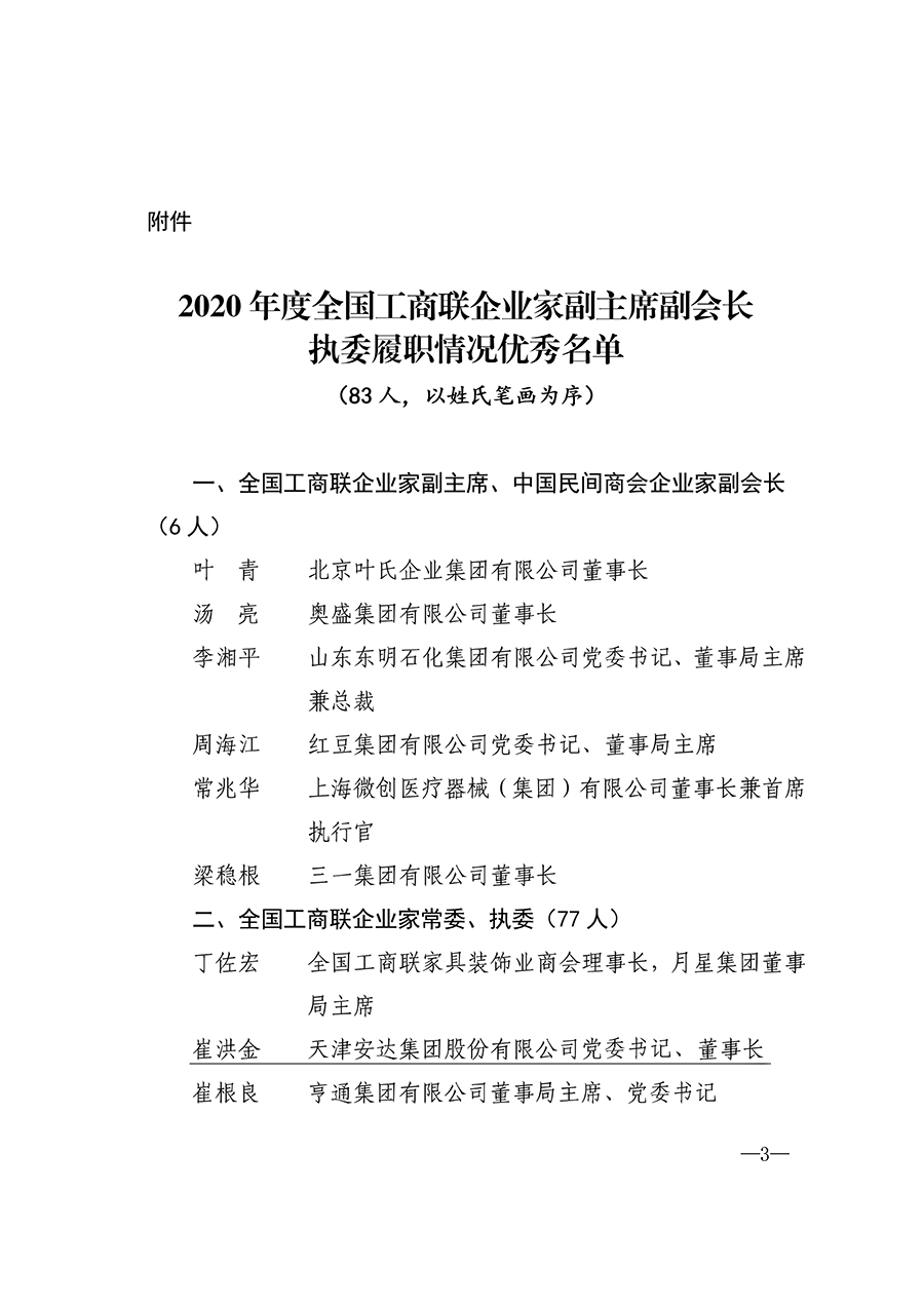 13日2021-09近日,全國工商聯(lián)發(fā)布《關(guān)于對2020年度履職情況優(yōu)秀的全國工商聯(lián)企業(yè)家副主席副會長執(zhí)委給予表揚(yáng)的通報》。《通報》指出,2020年度面對突如其來的新冠肺炎疫情沖擊影響,各位企業(yè)家副主席、副會長、執(zhí)委認(rèn)真學(xué)習(xí)貫徹習(xí)近平新時代中國特色社會主義思想,以實際行動響應(yīng)中央號召,積極投身抗擊疫情狙擊戰(zhàn),...[查看詳情]