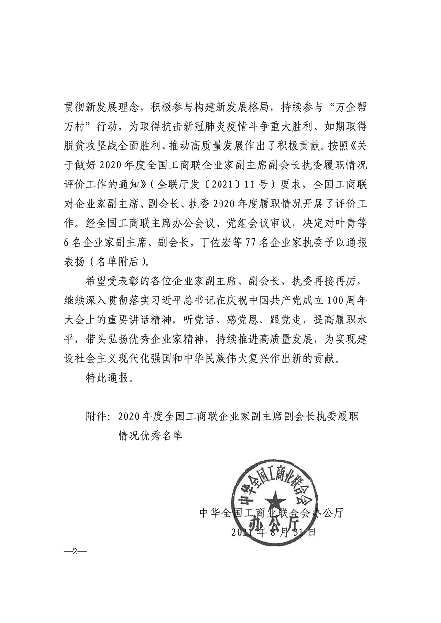 近日,全國(guó)工商聯(lián)發(fā)布《關(guān)于對(duì)2020年度履職情況優(yōu)秀的全國(guó)工商聯(lián)企業(yè)家副主席副會(huì)長(zhǎng)執(zhí)委給予表?yè)P(yáng)的通報(bào)》。《通報(bào)》指出,2020年度面對(duì)突如其來(lái)的新冠肺炎疫情沖擊影響,各位企業(yè)家副主席、副會(huì)長(zhǎng)、執(zhí)委認(rèn)真學(xué)習(xí)貫徹習(xí)近平新時(shí)代中國(guó)特色社會(huì)主義思想,以實(shí)際行動(dòng)響應(yīng)中央號(hào)召,積極投身抗擊疫情狙擊戰(zhàn),統(tǒng)籌做好疫情防控和復(fù)工復(fù)產(chǎn),主要服務(wù)“六穩(wěn)”“六保”,認(rèn)真貫徹新發(fā)展理念,積極參與構(gòu)建新發(fā)展格局,持續(xù)參與“萬(wàn)企幫萬(wàn)村”行動(dòng),為取得抗擊新冠肺炎疫情斗爭(zhēng)重大勝利、如期取得脫貧攻堅(jiān)戰(zhàn)全面勝利、推動(dòng)高質(zhì)量發(fā)展作出了積極貢獻(xiàn)。按照《關(guān)于做好2020年度全國(guó)工商聯(lián)企業(yè)家副主席副會(huì)長(zhǎng)執(zhí)委履職情況評(píng)價(jià)工作的通知》要求,全國(guó)工商聯(lián)對(duì)企業(yè)家、副主席、副會(huì)長(zhǎng)、執(zhí)委2020年度履職情況開(kāi)展了評(píng)價(jià)工作。經(jīng)全國(guó)工商聯(lián)主席辦公室會(huì)議、黨組會(huì)議審議,決定對(duì)葉青等6名企業(yè)家副主席、副會(huì)長(zhǎng),丁佐宏等77名企業(yè)家執(zhí)委予以通報(bào)表?yè)P(yáng)。