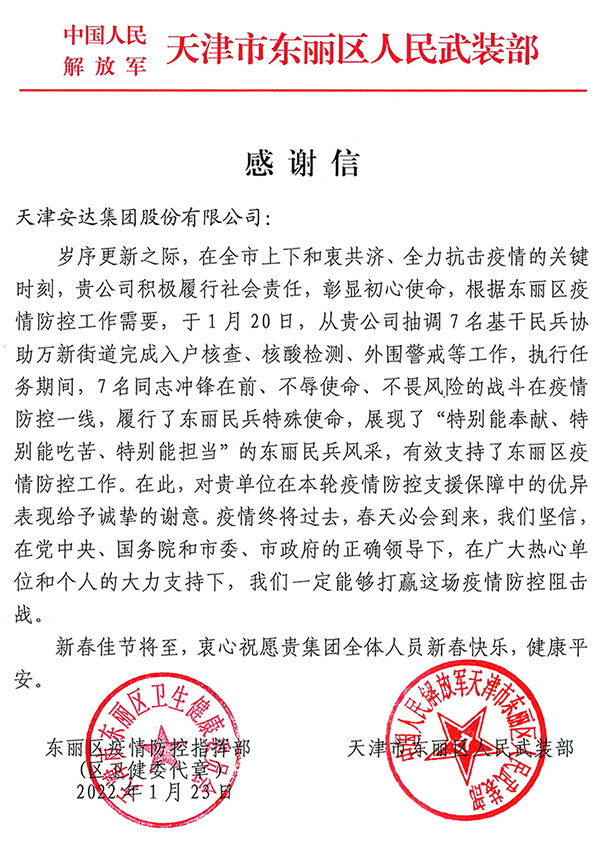 1月19日,市疫情防控指揮部發(fā)布2022年7號通告。為切實保障人民群眾生命安全和身體健康,有力阻擊疫情進一步擴散傳播,鞏固目前防控處置工作取得的成效,市疫情防控指揮部決定,將于1月20日6時起在全市范圍開展第四次全員核酸檢測。我集團民兵運輸連積極響應上級單位號召,派出7位基干民兵協(xié)助萬新街道完成入戶核查、核酸檢測、外圍警戒等工作,受到東麗區(qū)疫情防控指揮部、東麗區(qū)人民武裝部隊的高度認可,并寄來感謝信。具體內(nèi)容如下: