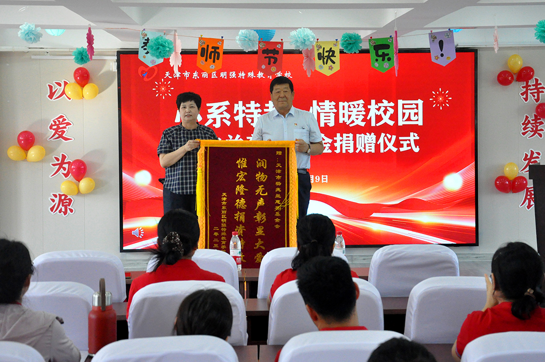 隨后的捐贈(zèng)儀式上,崔洪金代表天津市楊兆蘭慈善基金會(huì),將 10 萬元教師專項(xiàng)改善資金交付明強(qiáng)特殊教育學(xué)校校長尚俊歆手上。尚校長表示該筆資金將精準(zhǔn)用于教師發(fā)展基金,支持教師參與特教專業(yè)培訓(xùn)、教研交流活動(dòng),為教師成長賦能。為表感謝,尚校長向崔洪金董事長贈(zèng)送錦旗。