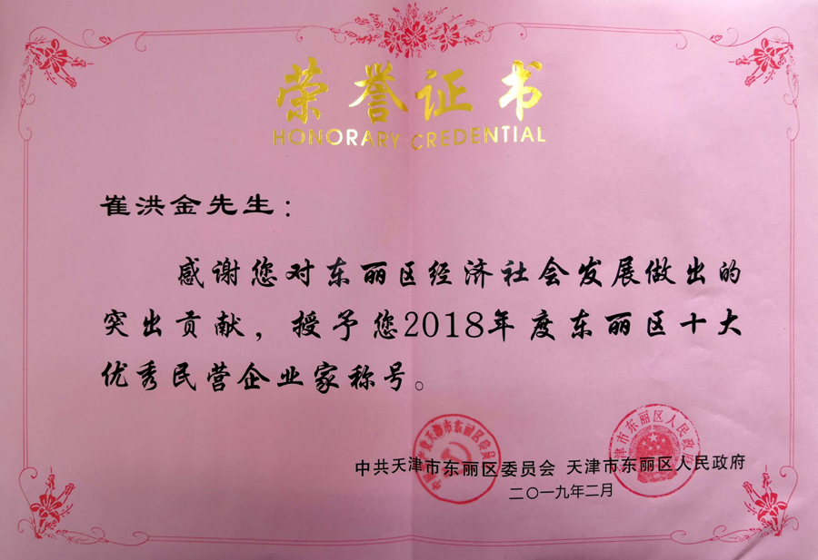 安達(dá)集團(tuán)黨委書記、董事長崔洪金榮獲2018年度東麗區(qū)十大優(yōu)秀民營企業(yè)家并頒發(fā)證書。