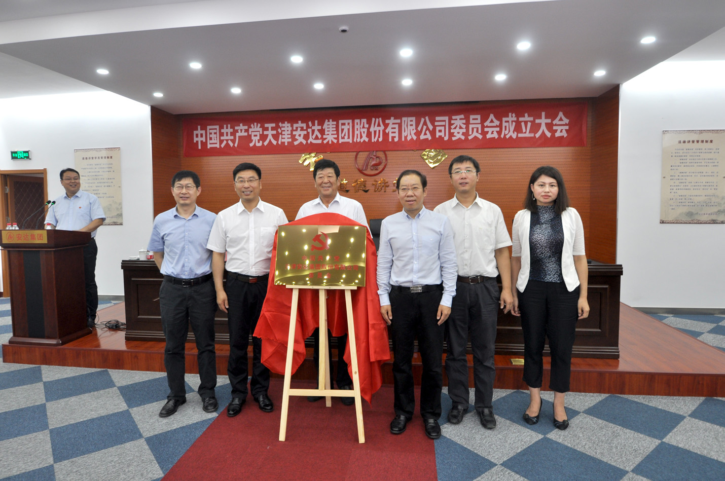 會上區工商聯調研員會員企業黨委委員劉樹義宣讀有關天津安達集團股份有限公司黨委成立的批復,市工商聯黨組書記劉道剛攜手區委副書記白鳳祥共同為安達集團黨委揭牌,安達集團黨委書記董事長崔洪金發表講話。